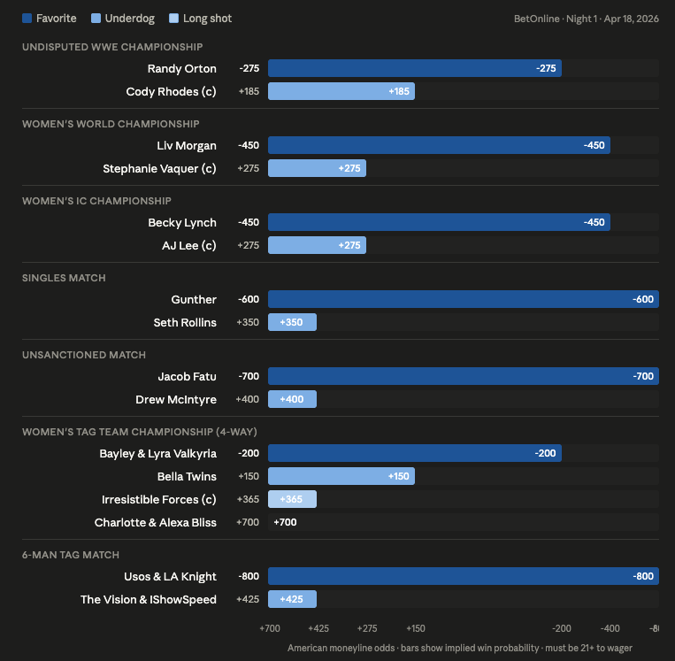 There was an upset in this match a year ago, as Lyra Valkyria brought in Becky Lynch as a surprise partner to win as +250 underdogs. The investment is pending the status of the Bella’s, as their absence would pivot a wager on the champs retaining with a push off of these programs to Backlash.